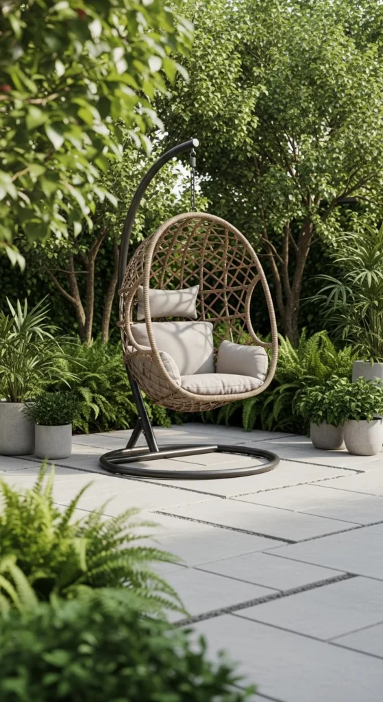 Egg chairs act like sculpture. One is enough. Too many crowd the space. Choose woven resin over natural rattan for weather tolerance. Statement seating adds personality fast. Place it slightly off-center so it feels intentional, not random. Neutral cushions keep it calm; add one accent pillow if color feels flat. For smaller patios, wall-mounted versions free floor space. Anchor stands properly so sway feels smooth, not shaky.