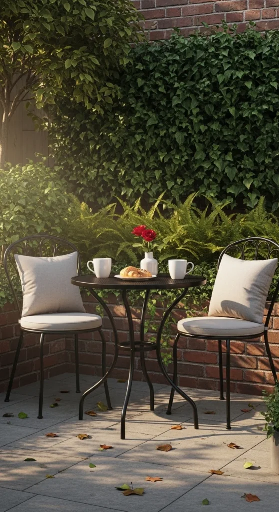 Bistro sets suit quiet meals and coffee breaks. They tuck into corners where full dining tables don’t fit. Small tables encourage daily use rather than special occasions only. Choose foldable chairs for easy storage. Metal handles weather better than wood in damp climates. Add a compact umbrella or wall-mounted shade if sun hits directly. Keep table decor simple. One plant or lantern does the job.