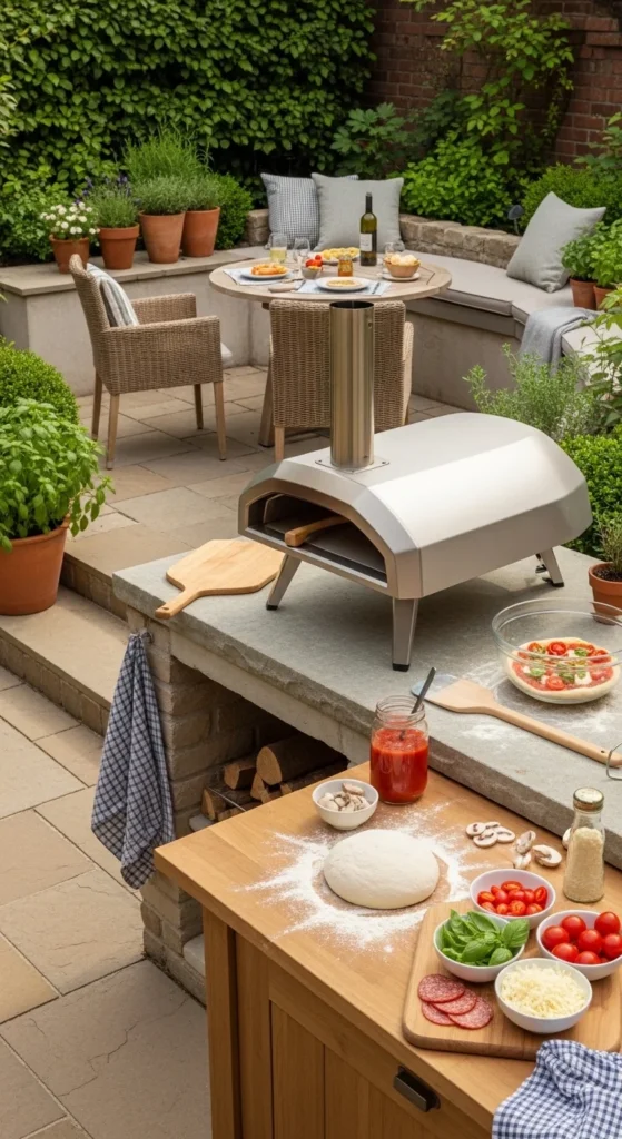 Pizza ovens turn patios into social centers. Countertop models cost less and heat fast. Cooking outdoors keeps guests nearby instead of stuck inside. Place ovens downwind from seating. Add a heat-resistant surface and a small prep table. Store tools on hooks to save space. If ovens feel like too much, a pizza stone on a grill gives a similar experience. Keep fire safety clear and simple.