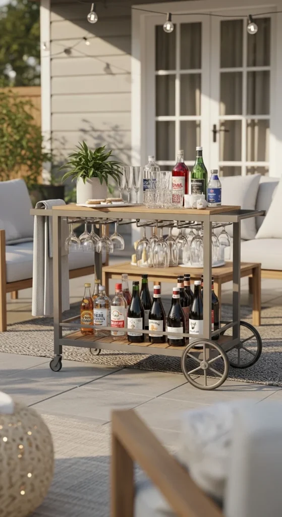 Bar carts keep hosting flexible. Roll them where people gather instead of fixing drinks in one spot. Mobility keeps layouts adaptable. Choose powder-coated metal frames for weather tolerance. Store liquids indoors when not in use. Add a tray to prevent spills while moving. For tight patios, slim carts fit between seating zones. A small plant or lantern keeps it from feeling utilitarian.