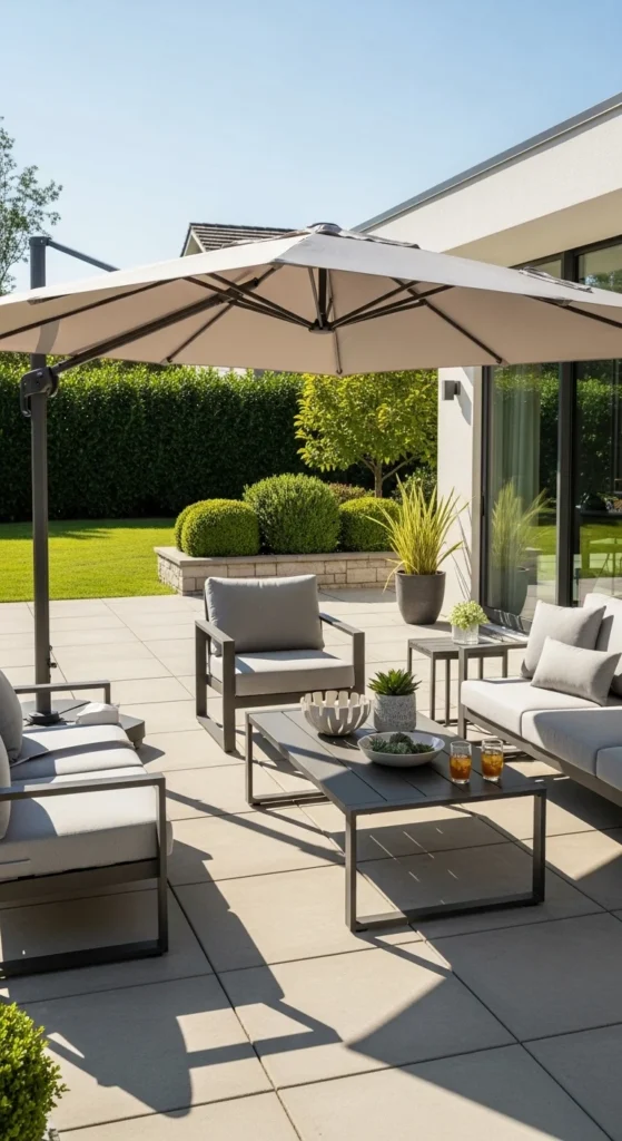 Cantilever umbrellas free space around tables. The base stays off to the side. Side-mounted shade covers more area without crowding seating. Fill bases fully so wind doesn’t shift them. Choose fade-resistant fabric in light tones. When storms approach, close and secure canopies to extend fabric life. Pair umbrellas with low seating so shade coverage feels balanced.