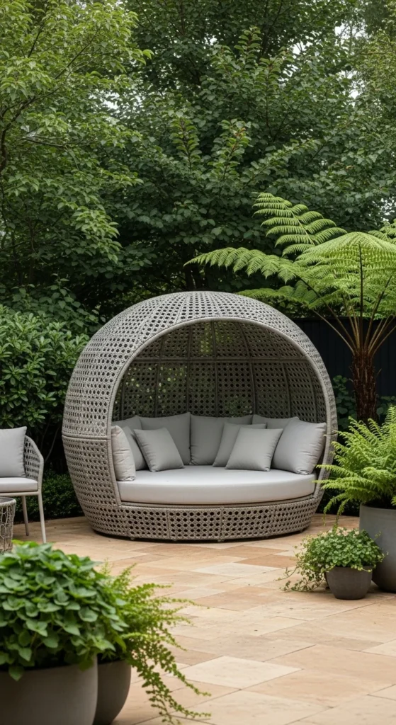 Lounge pods feel like private rooms without walls. They work best as a single focal piece rather than part of a set. Curved shapes soften patios filled with straight lines. Enclosed seating creates instant retreat energy. For smaller yards, choose half-shell designs instead of full enclosures to keep airflow moving. Look for removable cushions so cleaning stays simple. Position the pod where it catches morning or late-afternoon light, not harsh midday sun. Add one side table nearby so drinks don’t clutter seating. If budgets are tight, mimic the look with a canopy daybed and sheer outdoor curtains. It delivers the same sense of separation without the price tag.
