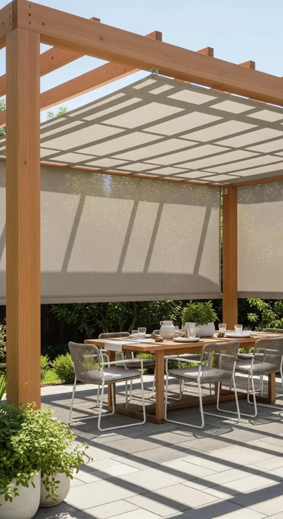 Pergolas give structure without closing the space in. A retractable canopy adds control during harsh sun or light rain. Aluminum kits assemble faster, while wood feels warmer. Shade control changes how often patios get used. For DIY installs, anchor posts with concrete footings to avoid wobble. Choose fade-resistant fabric in light tones to keep heat down. String lights or solar pendants mounted to beams handle nighttime use. If budgets are tight, start with the frame and add the canopy later. Curtains on two sides create privacy and block low sun. Keep furniture simple underneath so the structure stays the focus.