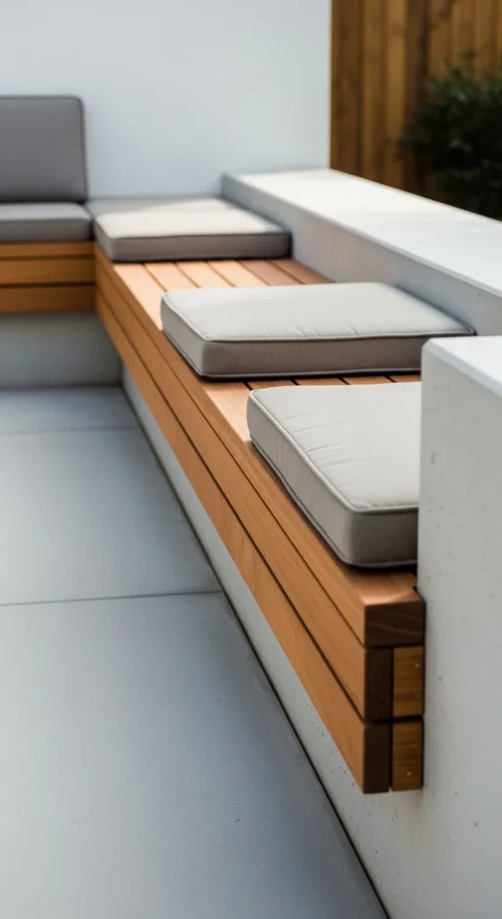 Built-in benches save floor space and guide traffic flow. They work well along fences or retaining walls. Use pressure-treated lumber or masonry bases for longevity. Fixed seating keeps patios organized during gatherings. DIY versions can double as storage with lift-up lids. Keep cushion colors light so the structure doesn’t feel heavy. Add small throw pillows for comfort without clutter. If backs aren’t built in, lean removable cushions against the wall. It allows layout tweaks later. Finish edges smoothly so guests don’t catch clothing or skin.