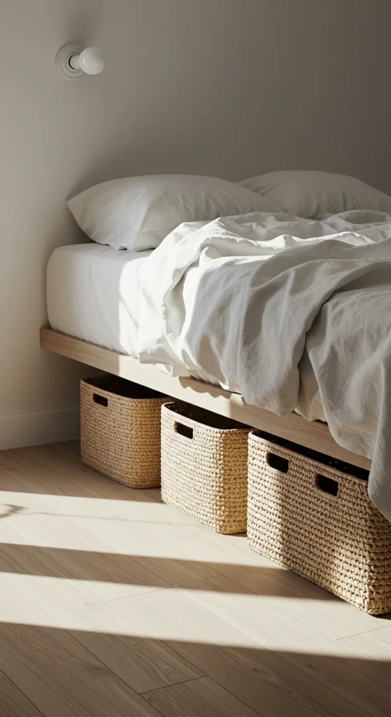 Keep clutter out of sight with baskets or rolling drawers. Great for storing off-season clothes, bedding, or shoes. Choose woven textures that complement your decor. Stylish and functional — perfect for small bedrooms.