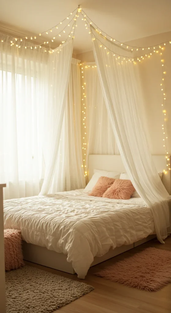 String lights instantly make a room feel magical. Hang them from your ceiling or canopy frame for a warm, ambient glow. Use warm white tones, not bright white, for a soothing look. You can secure them with removable hooks — no damage needed. Great for cozy nights, reading corners, or relaxing before bed.