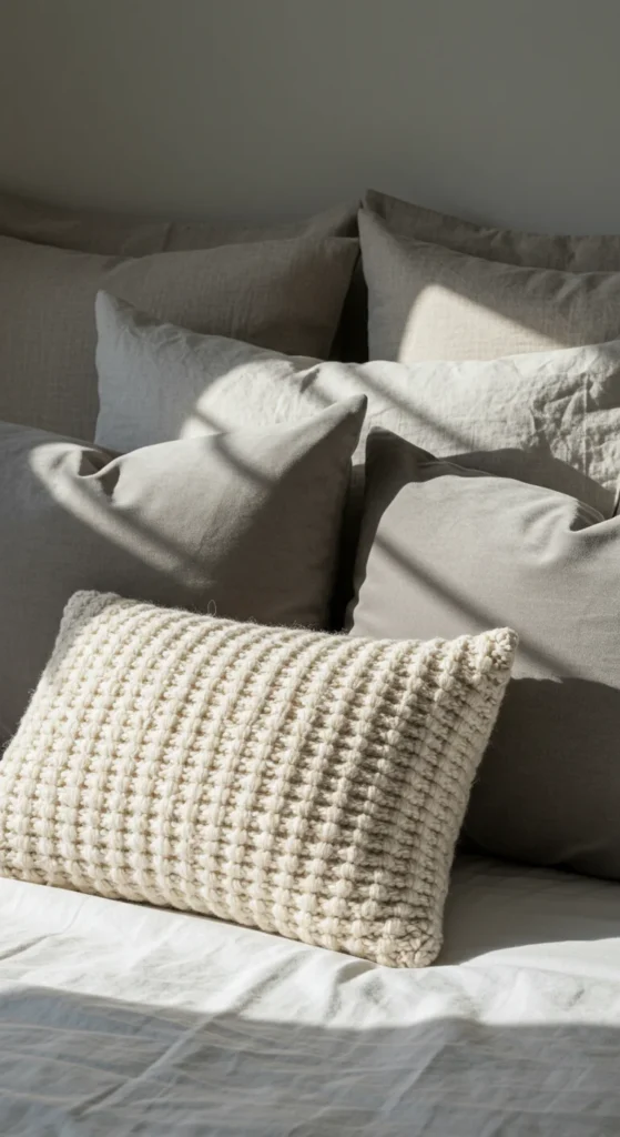 Pillows are an easy decor refresh. Mix textures, shapes, and sizes. Stick to a cohesive palette for a calming look. You don’t need many — just a few well-placed pillows can make your bed feel **inviting and layered**.