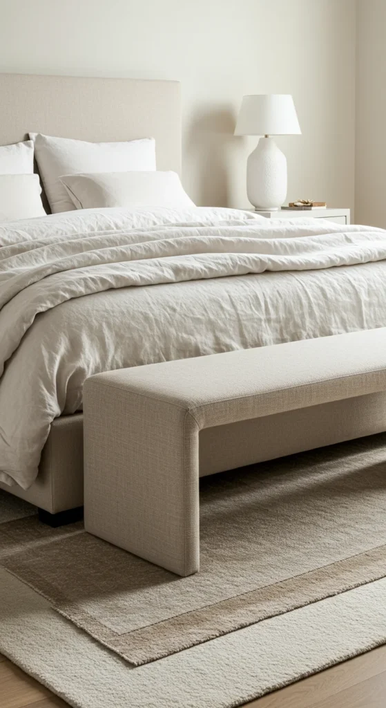 A bench adds both function and polish. Use it for storage baskets, extra blankets, or morning routines. Upholstered benches add softness, while wood designs bring structure. Keep it simple — it should blend seamlessly into your layout, not compete with the bed.