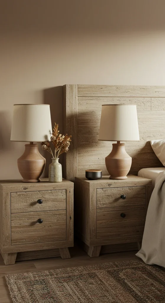 Raw wood instantly grounds a room. Rustic nightstands pair beautifully with linen or cotton bedding. They bring nature indoors without feeling too heavy. Style lightly — just a lamp, a book, and maybe a small vase for texture.