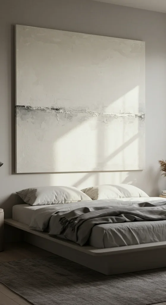 One big art piece feels sophisticated and serene. It eliminates clutter and anchors your focal point. Choose calming colors — beige, sage, or blush. You can even DIY your own abstract on a large canvas for under $50.