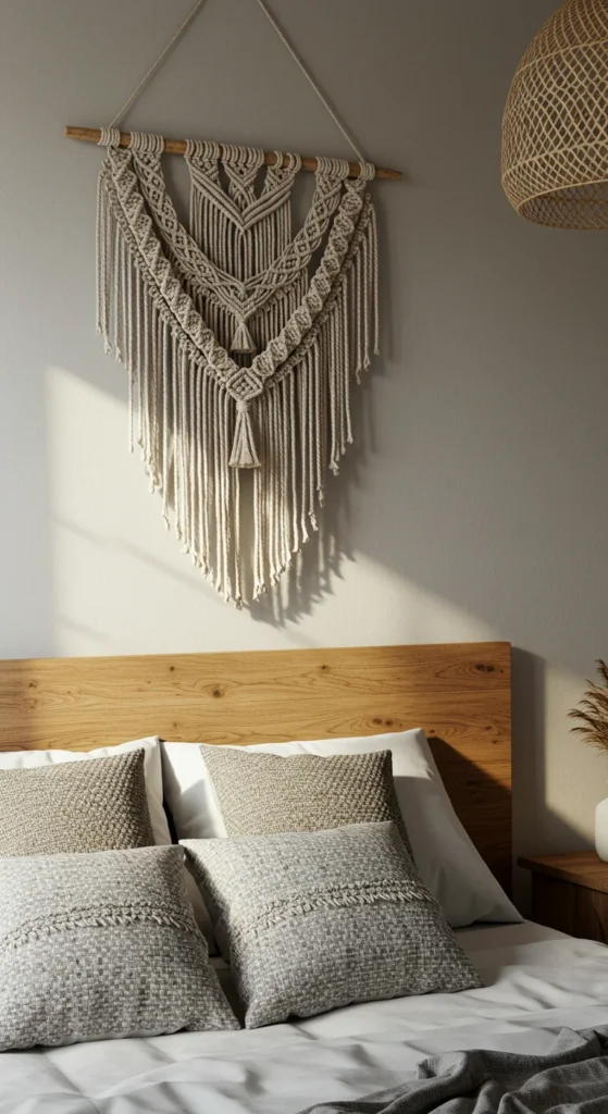 Macrame adds warmth and texture without feeling busy. Perfect for above the headboard or over a dresser. Choose creamy tones or soft pastels. If you’re crafty, make your own — it’s easier than it looks and costs very little.