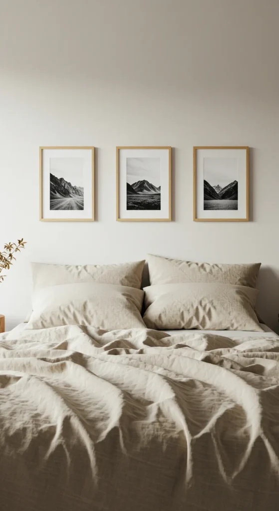 Line art is calm, modern, and timeless. Frame two or three small prints for a minimalist statement. Stick to black, white, or muted tones. The simplicity adds sophistication while keeping your walls light and airy.