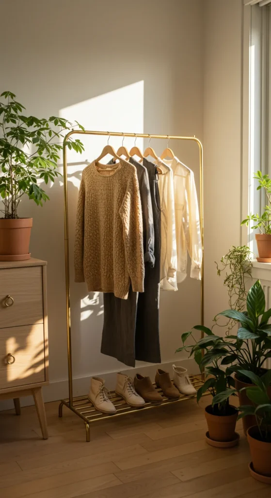 Clothing racks can double as decor when styled intentionally. Hang neutral, coordinated pieces and add a basket underneath. Great for small bedrooms or open layouts. It feels curated and functional — almost like a boutique corner in your home.