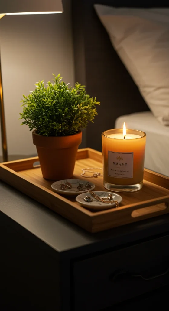 Trays create order out of clutter. Keep one on your nightstand or dresser to hold small items neatly. Add a candle, jewelry dish, or essential oil diffuser. It’s practical yet visually grounding.
