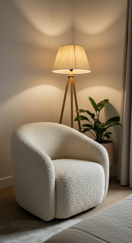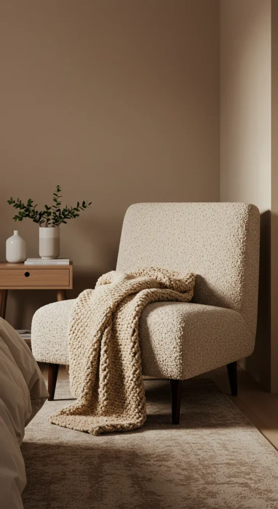 An accent chair creates a mini reading zone or a spot to unwind. Boucle or linen chairs add texture and comfort. Pair with a small throw blanket or cushion. It’s both functional and decorative.