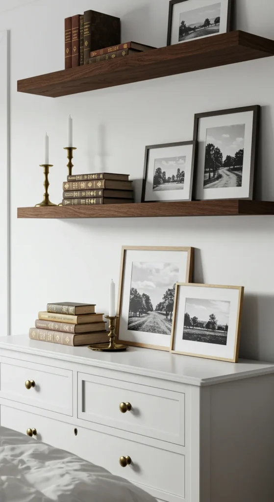 Floating shelves add both height and charm. Keep them uncluttered — 3–5 items per shelf is enough. Mix books, vases, and framed prints. Paint them the same color as your wall for a subtle, cohesive look.