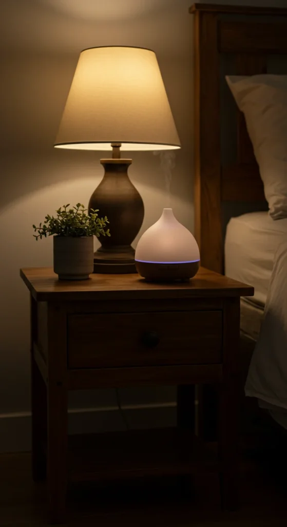 Scent and moisture improve rest quality. Use a diffuser with calming oils like lavender or cedarwood. If the air feels dry, a humidifier helps too. Keep your setup minimal — clean and relaxing to look at before sleep.