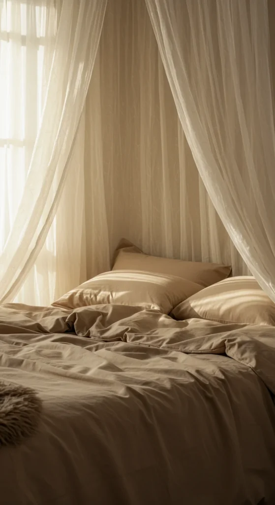 Canopy beds feel luxurious yet cozy. Drape sheer curtains or linen fabric for softness. If you’re renting, try a faux canopy using ceiling hooks and fabric. This instantly transforms your bed into a calming retreat.