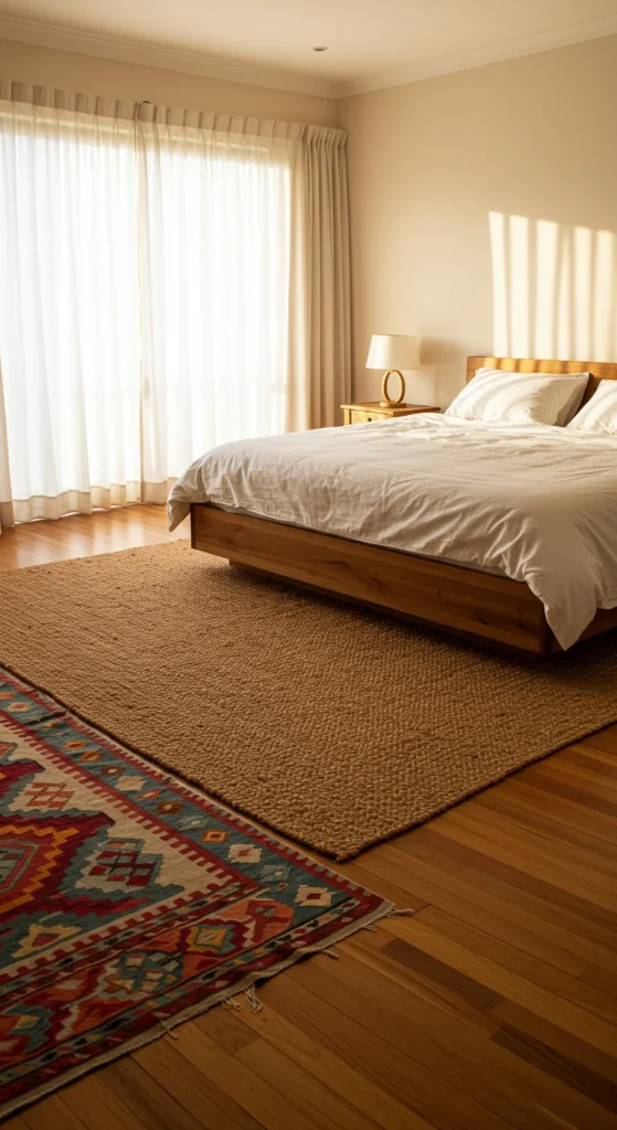 Rugs add warmth and texture underfoot. Layering two creates instant dimension. Use a natural fiber base and a smaller patterned rug on top. Perfect for grounding the bed and making mornings a little softer. Even budget rugs can look high-end when layered thoughtfully.
