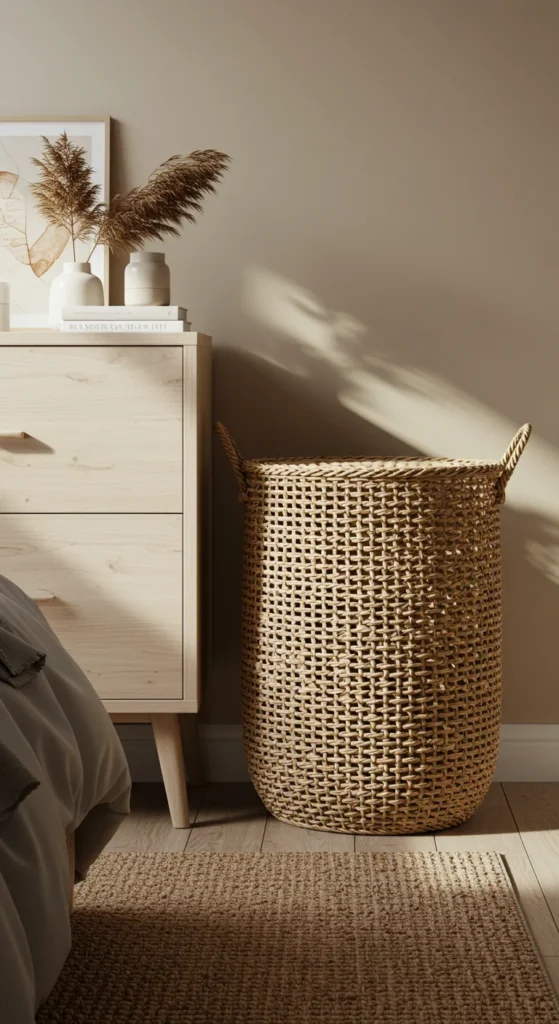 Even practical pieces can look beautiful. Choose a woven hamper to match your decor style. It hides clutter while adding texture. Pair with matching baskets for a cohesive, well-kept feel.