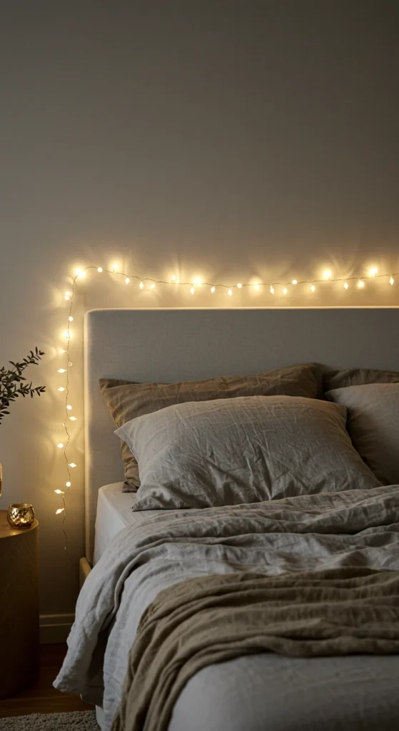 String lights are an easy way to create mood lighting. Hang them along your headboard, wall, or window frame. Choose warm white bulbs — they’re calming, not harsh. Use battery-operated ones to avoid messy cords. They make the space feel relaxed and personal, especially during evenings.