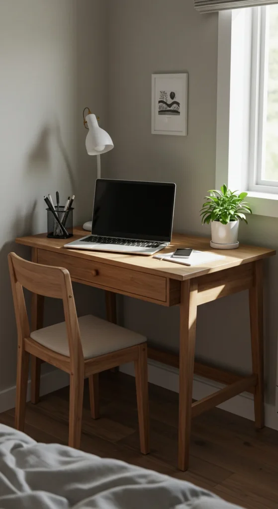 If you work from your bedroom, keep it tidy. A small desk setup can blend seamlessly into your decor. Stick to minimal accessories and light materials. Add a lamp or a candle for focus. Separate work and sleep mentally by facing the desk away from your bed.