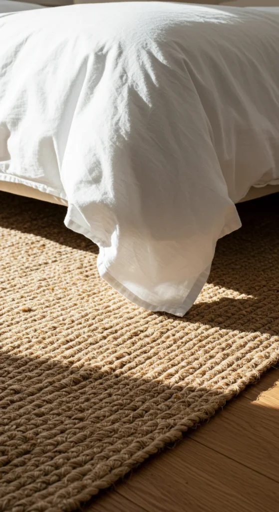 Natural fiber rugs like jute or sisal bring earthy texture to your bedroom. They’re durable, grounding, and match almost any color palette. Layer a smaller patterned rug on top for contrast. Perfect for barefoot mornings and cozy evenings.