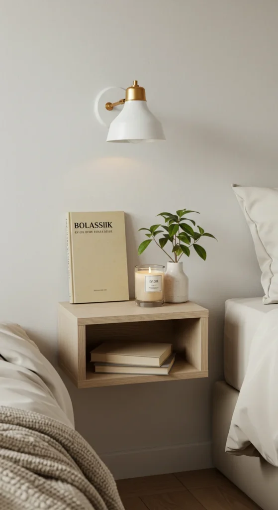 If you’re short on floor space, a wall-mounted shelf can replace a nightstand. Keep it simple — just the essentials. Great for small bedrooms or guest rooms. You can even add two in a row for layered storage.