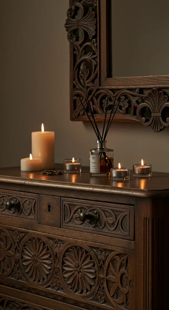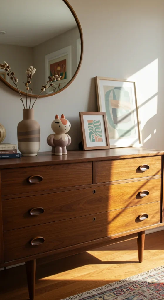 A mirror above a dresser brightens and balances the space. It also doubles as a quick check-in spot before heading out. Choose round for softness or rectangular for structure. Pair with candles or flowers for a finished look.