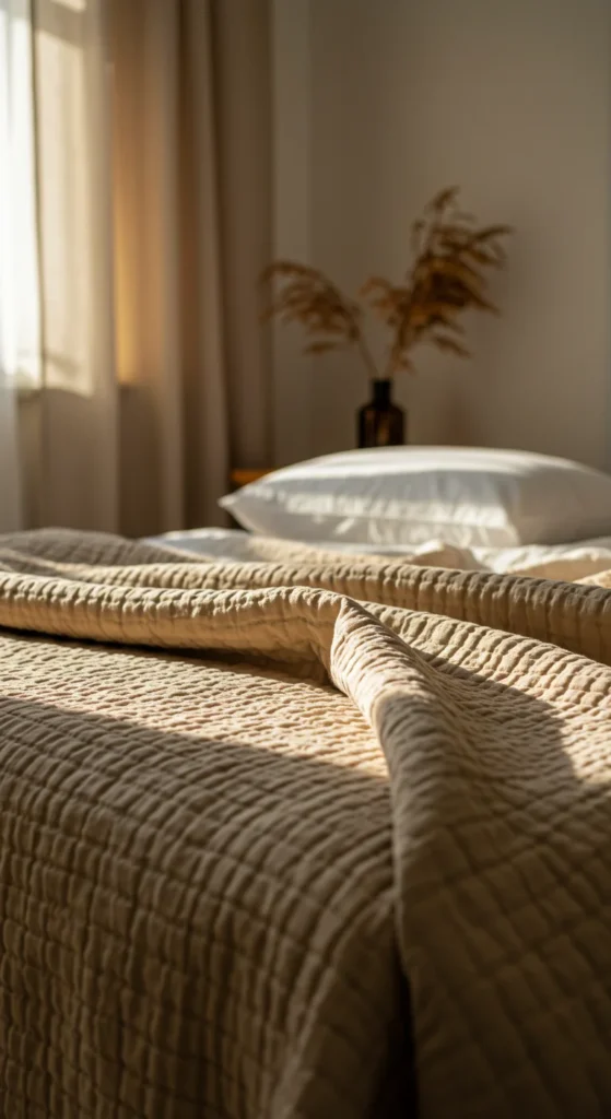 A lightweight quilt adds an extra layer of warmth and polish. Fold it halfway for a hotel-style finish. Choose quilted cotton or linen in earthy tones. Perfect for layering across seasons.