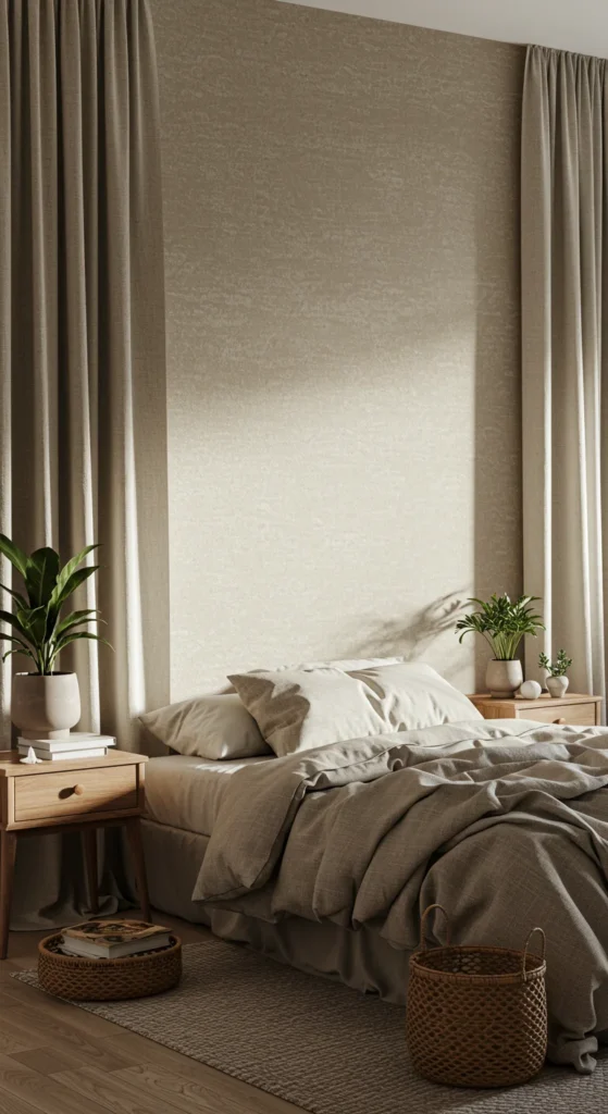 Textured wallpaper adds subtle detail without pattern overload. Grasscloth or linen-effect finishes work best. They add depth and warmth to minimalist spaces. Use behind your bed or on a single wall for balance.