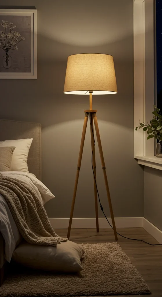 Corners often feel empty — a warm lamp fills them beautifully. Choose one with a soft shade and diffused light. It creates a peaceful reading or reflection spot. Great for apartments where overhead lighting feels too harsh.
