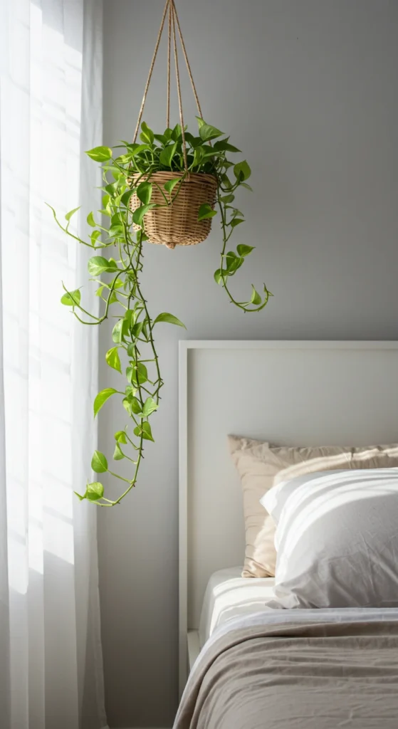 Plants overhead add softness and a hint of nature. Use a lightweight pot and ceiling hook. Perfect for low-maintenance greenery like pothos or ivy. It draws the eye upward and adds **calm organic movement** to your space.