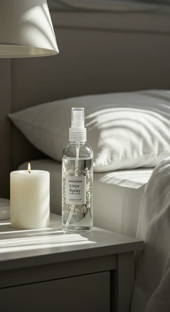 Spritz your pillows and sheets with a gentle linen spray. Lavender, rose, or bergamot are great for sleep. It’s an affordable way to make your room feel like a spa. A few sprays before bed refresh the entire mood of the space.