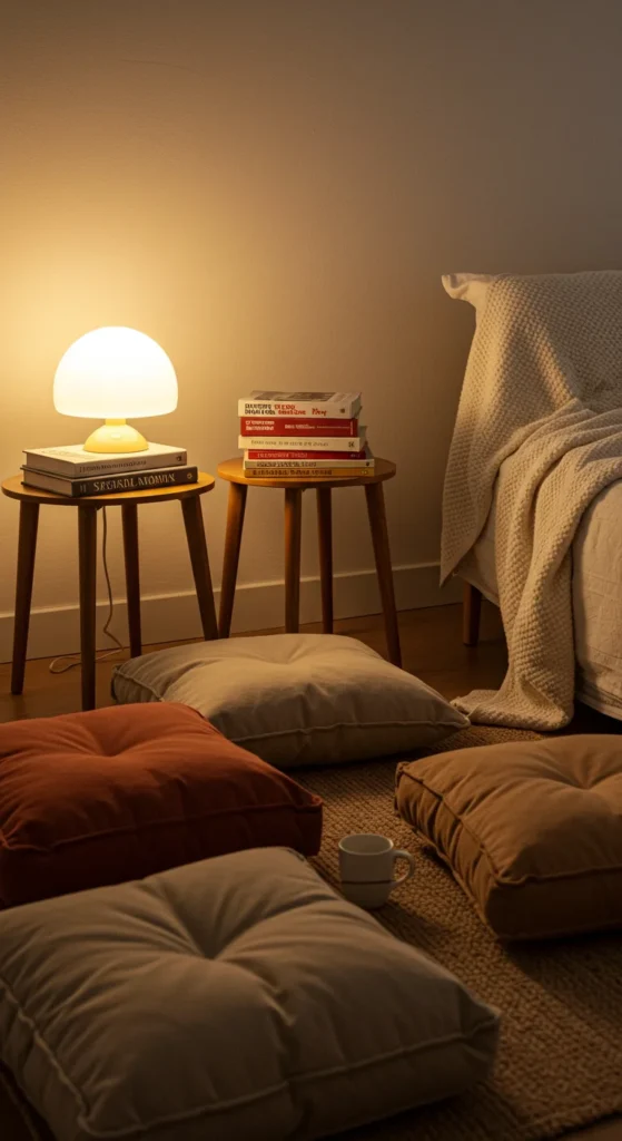 If space allows, make a cozy nook for reading or journaling. Add oversized cushions or beanbags, a small rug, and soft lighting. It becomes your personal retreat — perfect for slow mornings or unwinding at night.