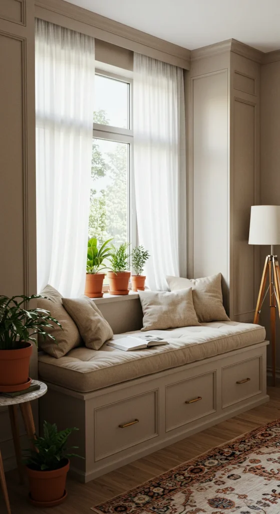 Turn your window area into a relaxation corner. Add a cushioned bench, throw pillows, and a soft blanket. Keep nearby shelves or baskets for books. It’s perfect for reading, journaling, or just soaking up sunlight.