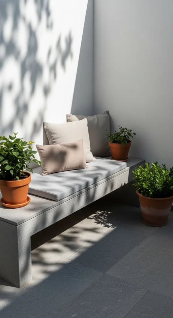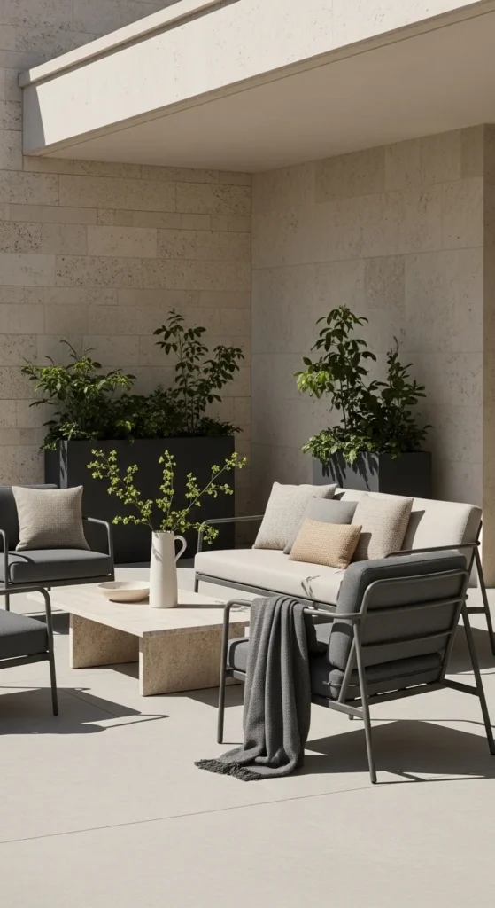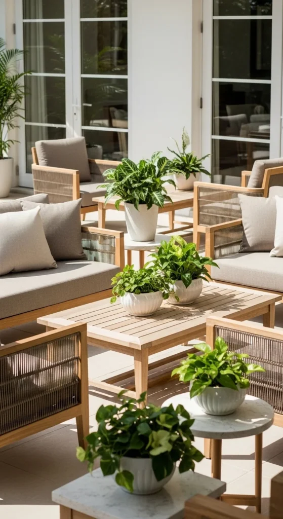 Herbs do more than look good. They bring scent and purpose. Grouping them in one corner keeps things tidy and intentional. Use matching pots or stay within one material family for a cohesive visual rhythm. Raised stands help smaller patios by freeing floor space. Terracotta works well since it ages gracefully. Label herbs subtly with small tags or etched markers. This keeps the look clean. Even balconies with limited space can fit three to five pots comfortably. If sunlight shifts, place herbs on trays so they’re easy to move. This setup adds life without decorative overload and pairs well with neutral furniture nearby.
