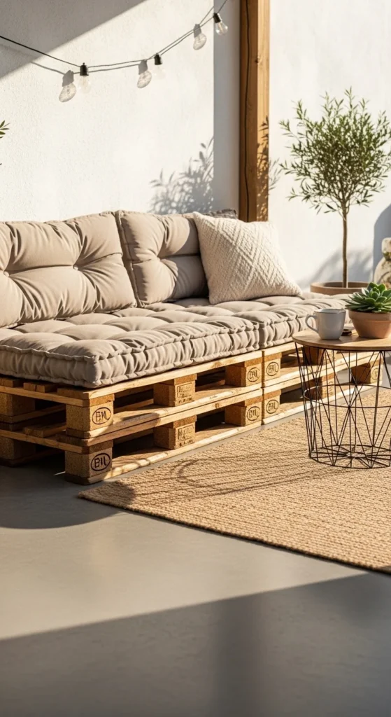 Pallet seating works well when done cleanly. Sand the wood smooth. Seal it so splinters stay away. Keep the shape low to the ground for a laid-back lounge feel. Neutral cushions make the setup feel deliberate instead of improvised. Add one back pillow per seat and stop there. Too much ruins the look. This idea suits patios where floor space is limited but seating matters. Pallets are often free or low-cost from local suppliers. Match the finish to nearby furniture so everything connects visually. A small side table nearby finishes the setup without crowding it.