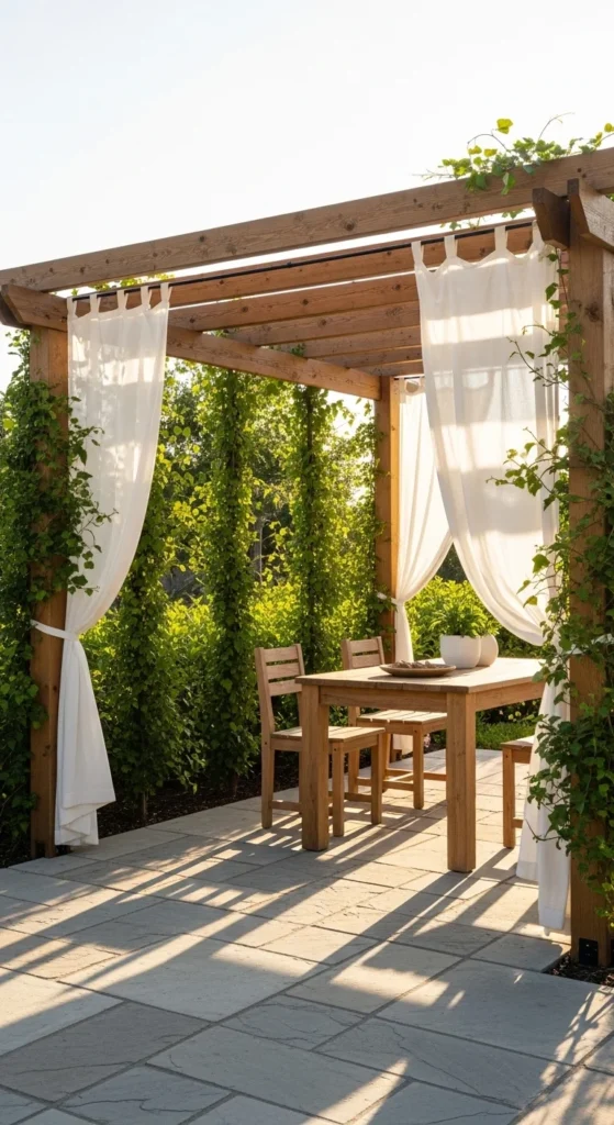 A pergola changes how a patio feels instantly. Even a simple kit adds structure. That overhead frame creates a defined outdoor room. Choose light wood or neutral metal so it doesn’t overpower the space. Sheer fabric panels soften sunlight and add movement. For savings, skip custom builds and go with modular kits. Many install in a day with basic tools. Keep furniture minimal underneath so the pergola stays the focal point. String lights or climbing plants complete the look without extra cost.