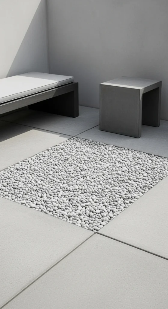 Pebbles bring texture where concrete feels flat. Use them in sections rather than full coverage to keep costs down. A border or corner area works best. This detail adds subtle luxury without major work. Lay landscape fabric first, then spread stones evenly. Stick to one stone color for a calm look. Pebbles pair well with planters and water features. Even a small patch can shift the mood of the entire patio. It’s a smart option for renters when installed in trays or framed boxes.