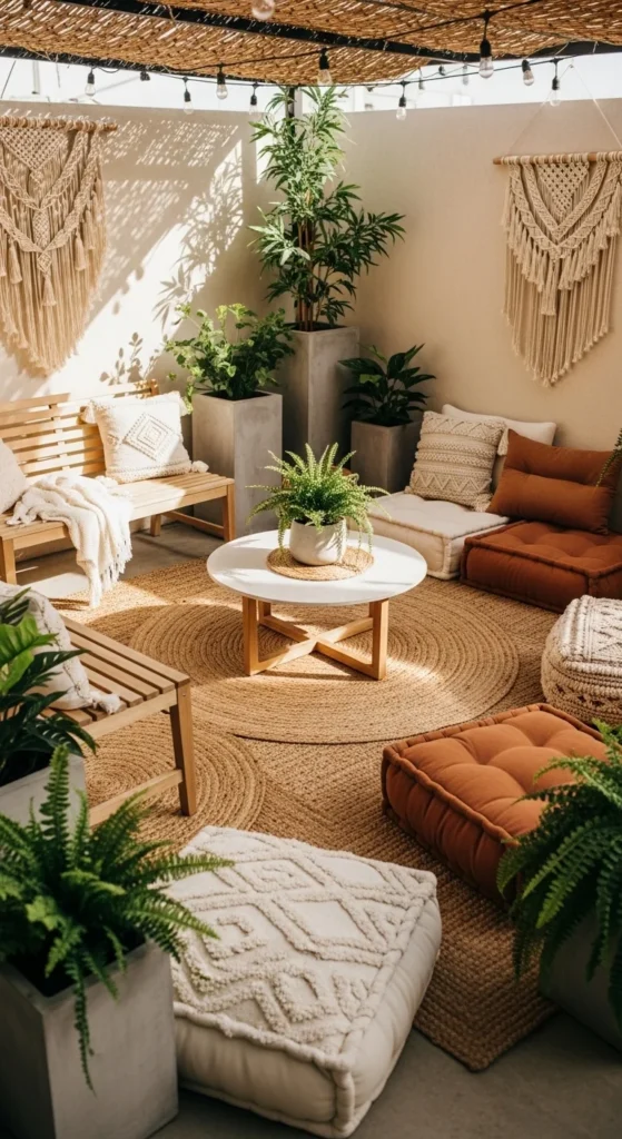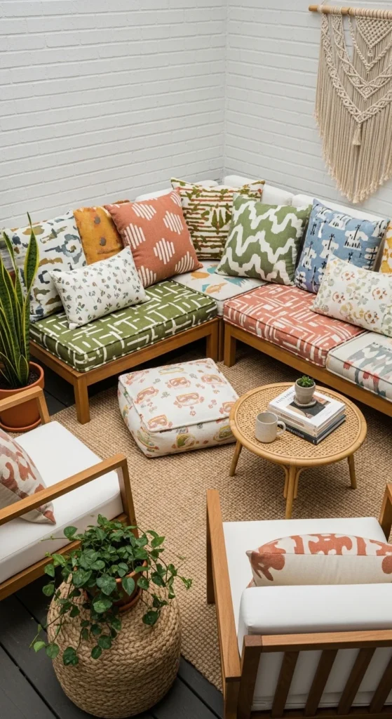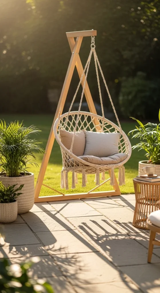 A hanging chair adds fun without taking permanent floor space. Choose foldable or removable designs for flexibility. Cushions make it cozy and soft. The floating effect adds visual lightness, which is great for small patios. Pair it with a small side table or floor mat. Renter-friendly options often use a frame rather than ceiling hooks. Even thrifted chairs can be refreshed with a simple cushion update. It’s a playful, budget-friendly way to create a reading or lounging nook.