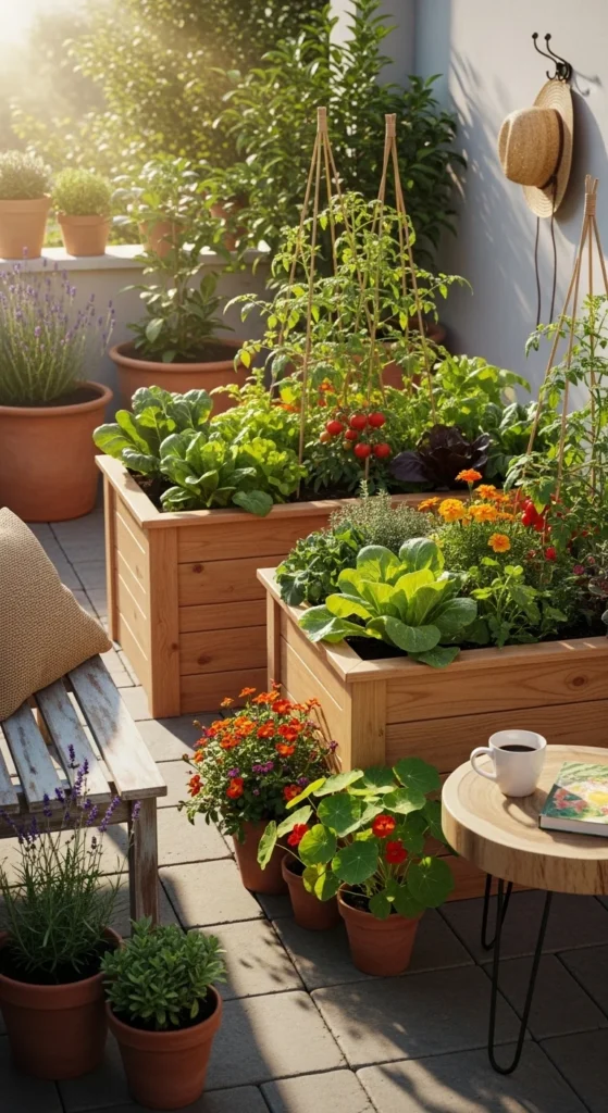 Raised beds blend beauty and function. Plant vegetables, herbs, or flowers together. Wood works well for a natural, warm look. Stick to compact dimensions for small patios. Group beds in odd numbers for balance. This creates a productive oasis without cluttering the floor. Top with mulch or pebbles for a finished appearance. DIY kits or reclaimed wood keep costs low. A few planters nearby can soften hard edges. Raised beds also make watering easier, especially in tight spaces where drip irrigation or hand watering is needed.