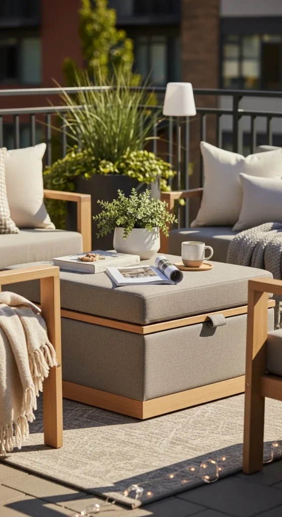 Ottomans do double duty. They serve as seating, tables, and hidden storage. Look for clean lines and neutral tones to avoid visual heaviness. Keep one or two accessories on top, like a tray or small plant. Inside, store blankets or garden accessories. This works well for small patios where floor space is precious. Buying one piece instead of two saves money and keeps the space open. For a personal touch, add a patterned throw or cushion. Even a thrifted ottoman can feel luxurious when styled correctly.