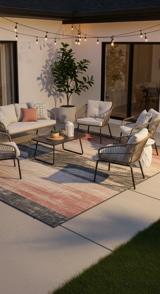 An outdoor rug instantly organizes a patio. It tells the eye where to sit. That sense of order reads intentional and polished. Choose polypropylene rugs since they handle rain and dirt well. Patterns hide wear better than solids. For tight patios, pick a rug just large enough for front chair legs. This avoids crowding. Layering also works by placing a small rug over plain concrete or stone. If the budget is tight, check end-of-season sales or online clearance. Rugs also soften sound and texture, which helps concrete-heavy spaces feel warmer. Stick to one color story across pillows and planters to keep things calm. This single addition often changes how the entire patio feels without moving a single wall.