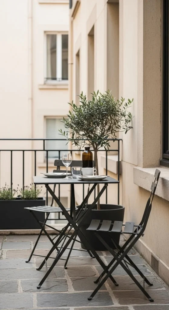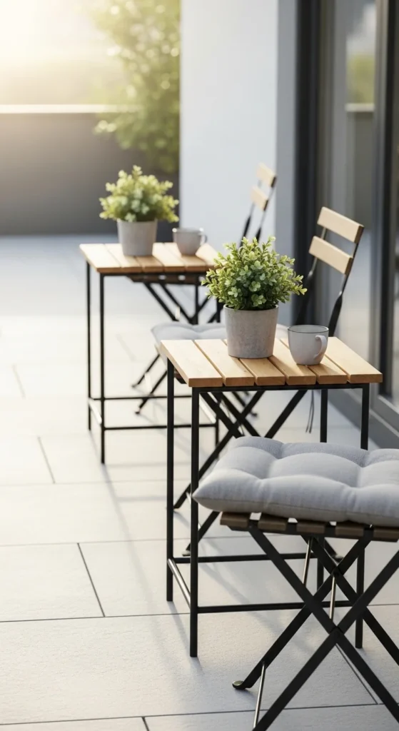 A foldable bistro set brings charm without crowding the floor. Slim profiles matter in tight patios. Metal sets last longer outdoors and age well with a simple wipe-down. Choose black, white, or muted green for a timeless café look. When not in use, fold everything flat and lean it against a wall. That flexibility keeps the area open for movement. Add one small centerpiece like a lantern or herb pot so the table stays uncluttered. Skip bulky cushions. Let the form do the work. Thrift stores and seasonal sales often carry these sets at low prices. If the finish looks tired, spray paint can change everything in an afternoon. This setup works well for morning coffee or evening drinks without committing to permanent furniture.