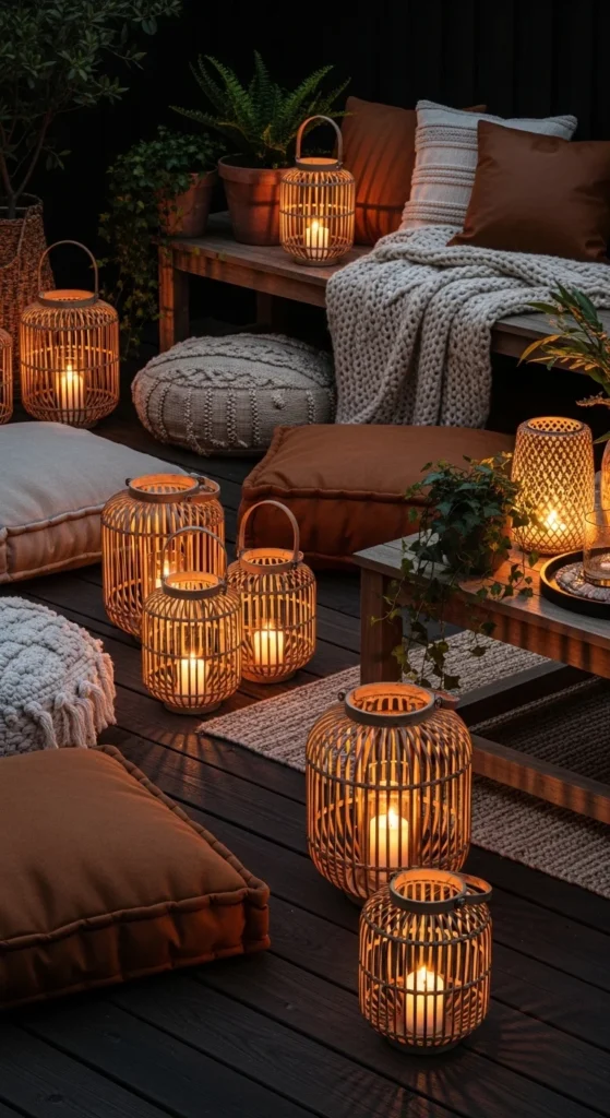 Woven lanterns give patios a handcrafted, natural vibe. Place them on tables, floors, or even hang them. Candles or LED lights add soft, warm ambiance. Choose neutral or earthy tones to keep the look refined. Larger lanterns anchor corners; smaller ones decorate tables. They pair beautifully with woven rugs or cushions. This inexpensive addition instantly makes patios feel curated and intimate. Even one or two well-placed lanterns can transform the space after dark without costing much.