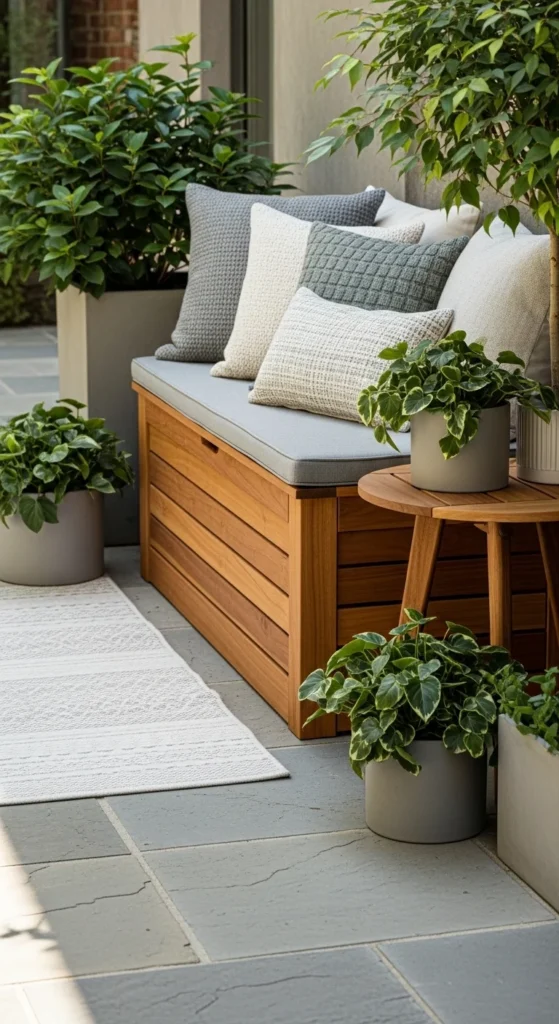 A storage bench does double duty. Seating on top. Storage below. That combo keeps patios from feeling crowded. Look for benches with clean lines and simple hardware. Paint or stain them to match your palette. Inside, store cushions, lanterns, or garden tools. Add two or three pillows for comfort, not more. This keeps the look clean and composed. If buying new feels pricey, convert a wooden chest with outdoor paint and a foam cushion. Place the bench against a wall or railing so it feels built-in. This trick works well for narrow patios where chairs eat up floor space.