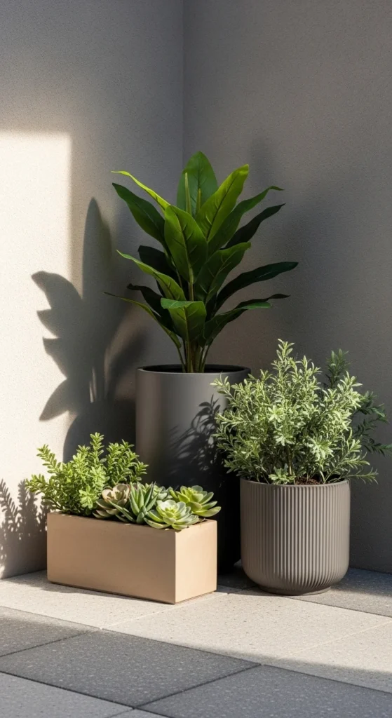 Faux greenery adds fullness without daily care. Grouping planters in odd numbers looks more styled than spreading them out. Mix heights. Mix textures. That layering creates visual depth. Choose realistic leaves with color variation. Avoid shiny finishes. Use heavier pots so nothing tips over in the wind. Place clusters near seating or corners to soften hard lines. This works well for patios with little sunlight. A single real plant mixed in can raise realism. Stick to one planter color family to avoid chaos. The effect feels lush and deliberate, even when space is tight.