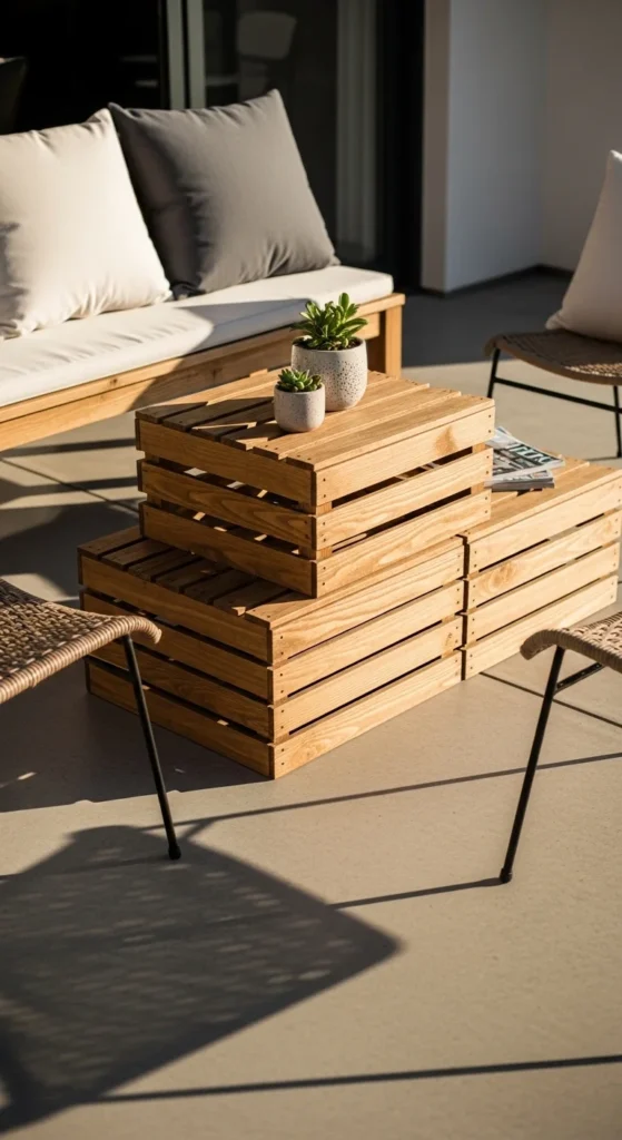 Wooden crates make an affordable table with character. Stack two or four, depending on height. Secure them with screws so nothing shifts. A light stain or matte seal keeps the texture visible. This piece brings natural warmth to concrete-heavy patios. Add a tray on top for drinks to keep surfaces flat. Inside storage holds books, throws, or candles. Casters underneath add mobility if space is tight. Keep the surrounding decor simple so the table feels intentional, not crafty. This works especially well with neutral seating and greenery nearby. It’s a low-cost piece that looks custom when styled thoughtfully.