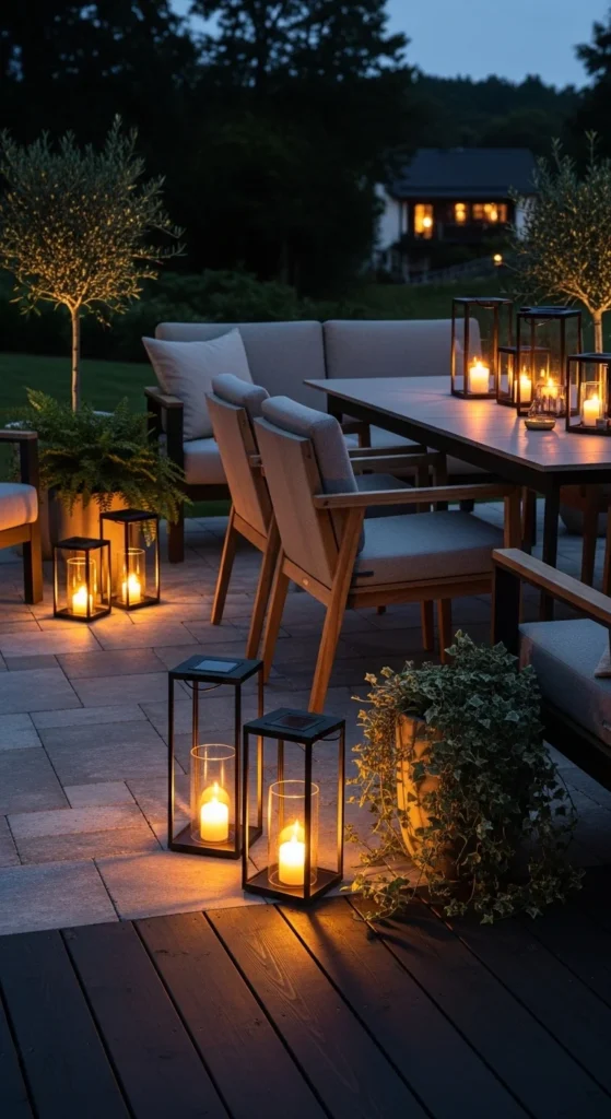 Solar lanterns add glow without cords or outlets. That simplicity keeps patios uncluttered. Place them at different heights for dimension. Warm-toned light reads more refined than bright white. Look for frosted glass or textured panels for a soft, diffused effect. During the day, they double as decor. Line them along edges or cluster two near seating. This guides movement at night and adds atmosphere. Solar options cost less over time and work well for renters. Avoid overloading the space three to five lanterns are enough for most small patios.